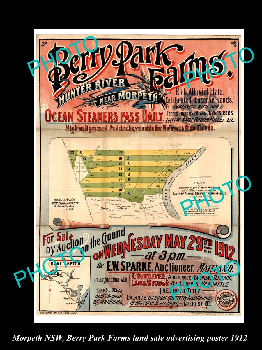 Old Large Historical Land Sale Advertising Poster, Morpeth Nsw C1912 Berry Park